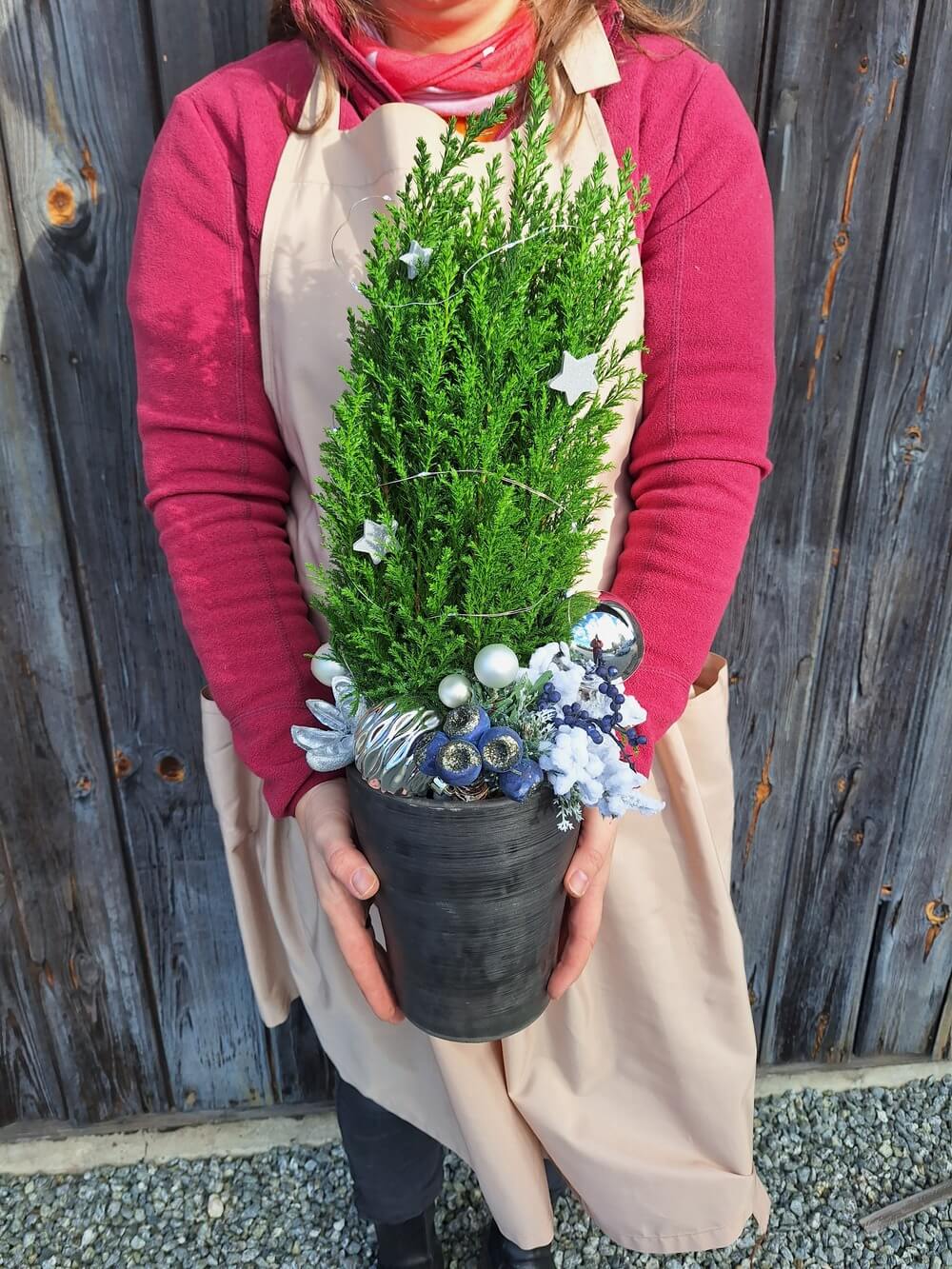 Nasze cyprysiki to gotowe choinki z ozdobami, które nie wymagają dodatkowych ozdób. Każde drzewko zostało starannie przystrojone bombkami, wstążkami oraz naturalnymi dodatkami, takimi jak susz, szyszki czy gałązki.