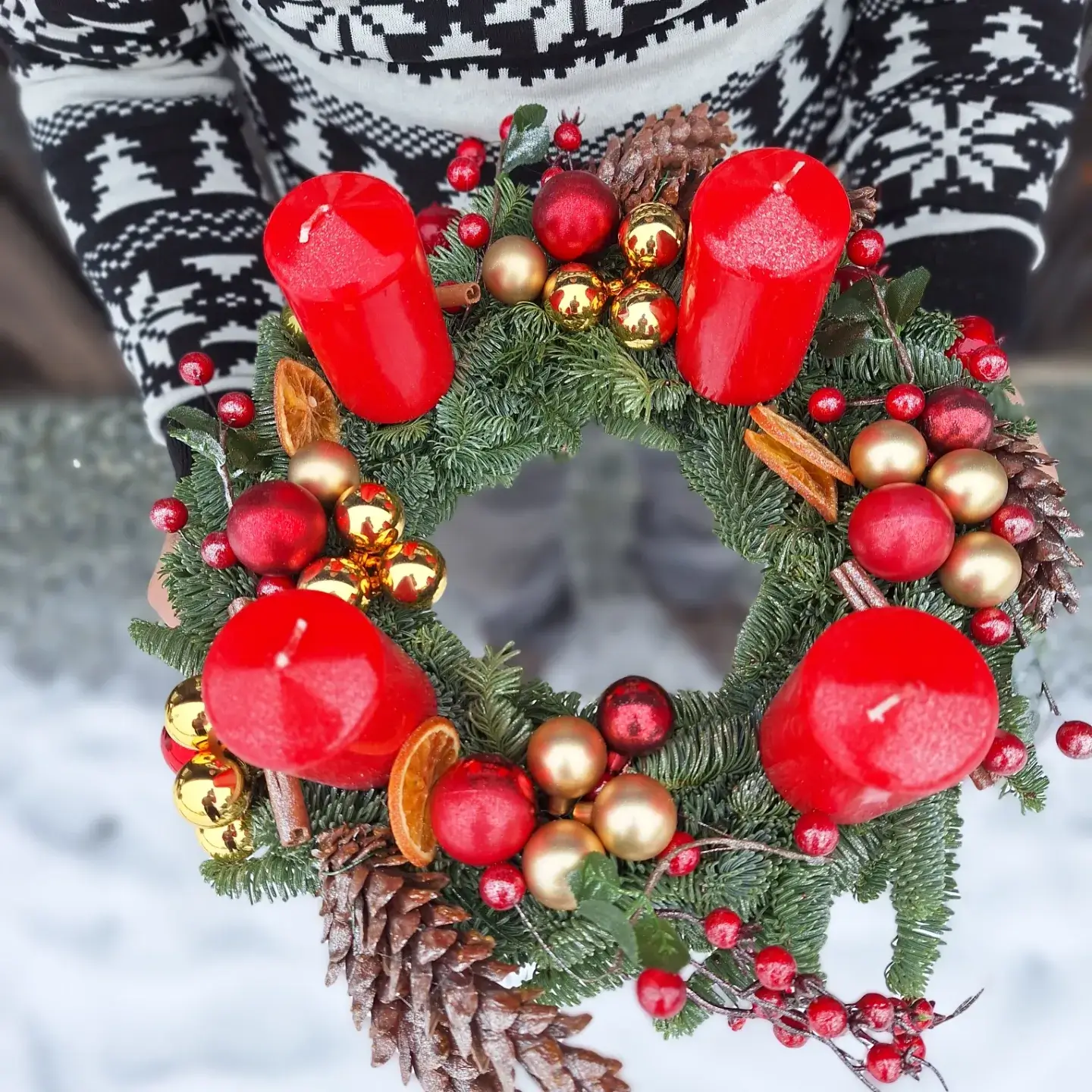 Elegancki i efektowny wianek adwentowy w klasycznych odcieniach czerwieni i złota to propozycja dla miłośników tradycyjnych dekoracji bożonarodzeniowych. Ten ręcznie wykonany stroik świąteczny doskonale wpisuje się w klimat świąt – ciepły, radosny i pełen blasku.