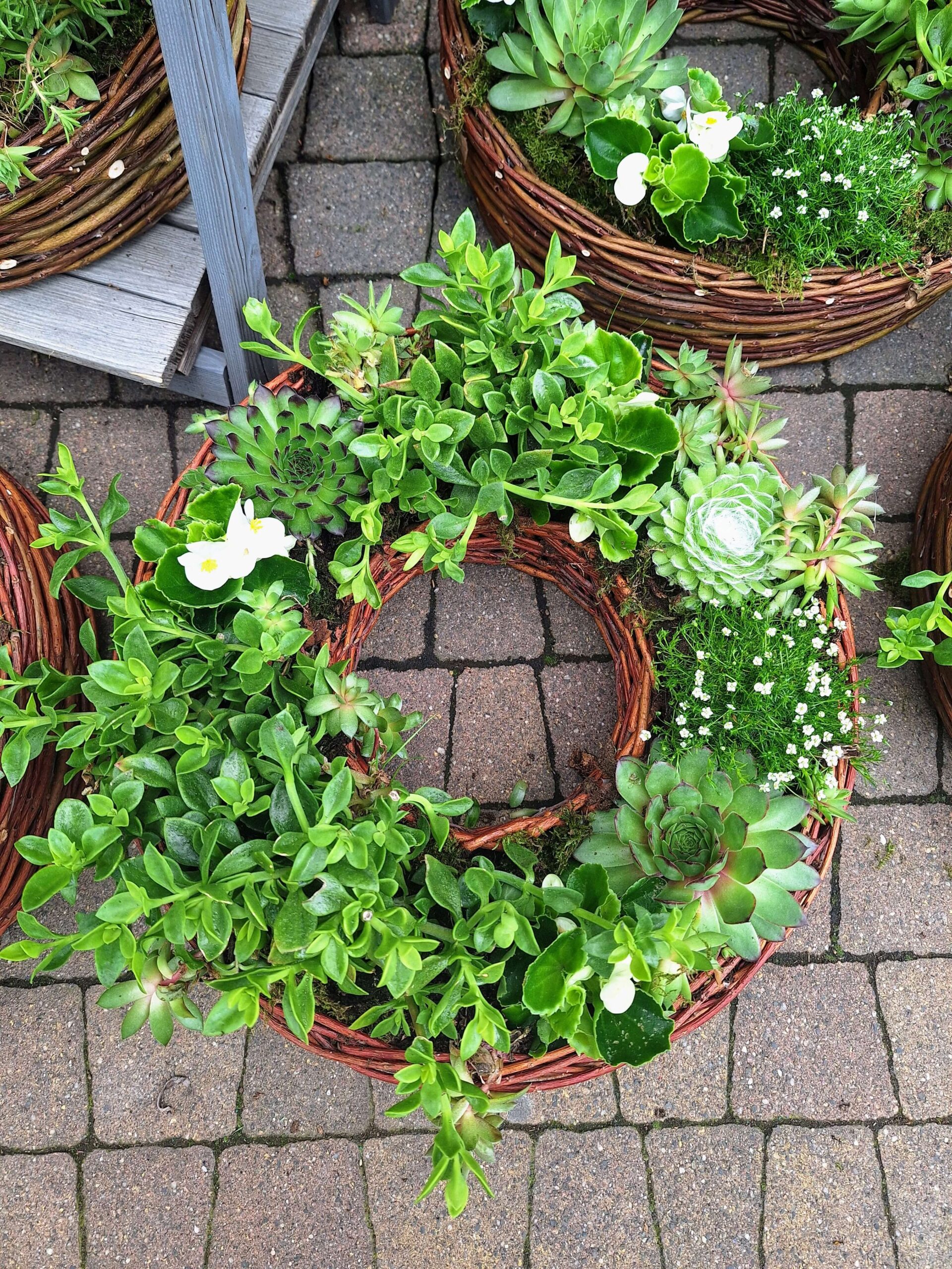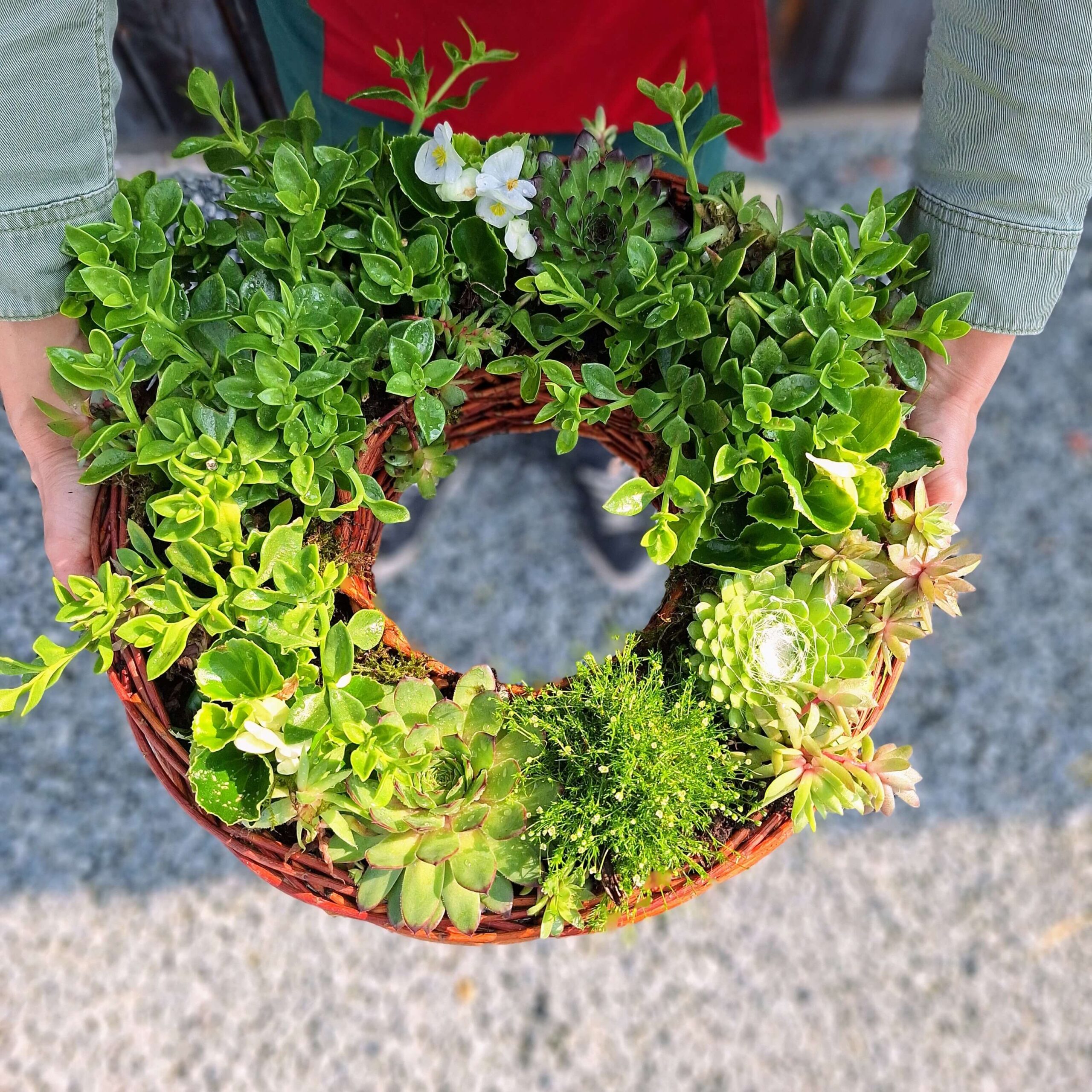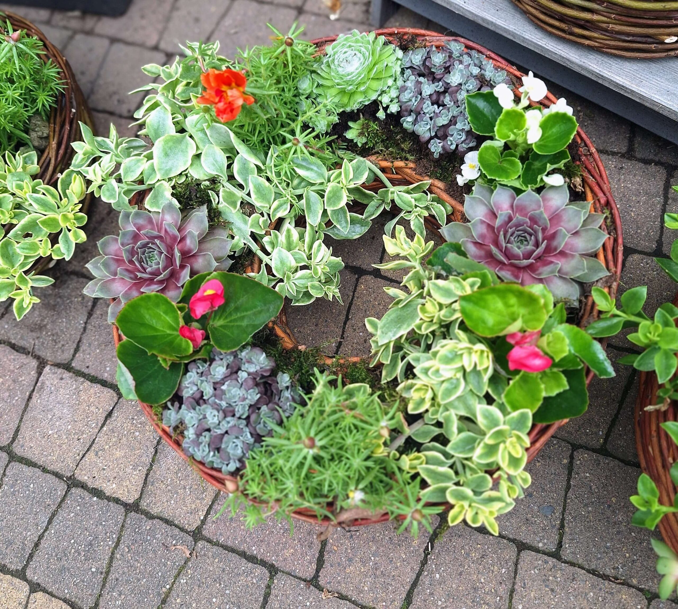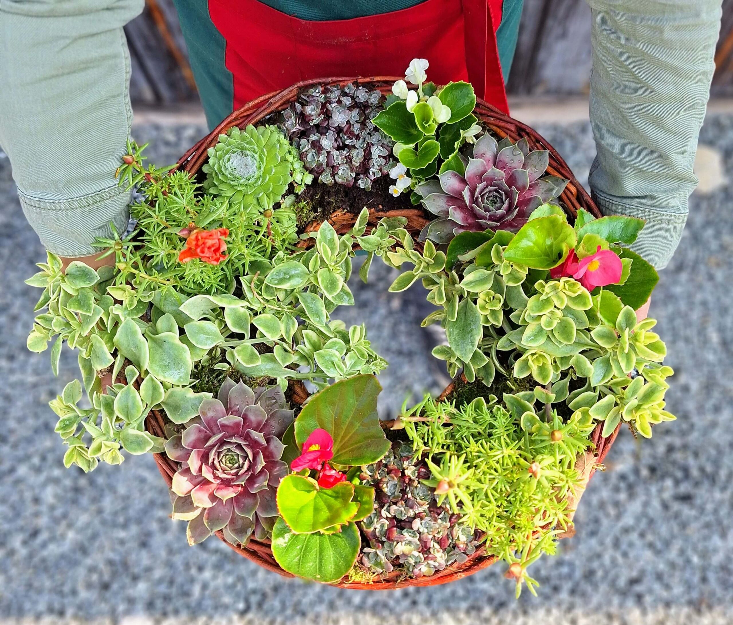 Rośliny: Letnia kompozycja z żywych roślin, idealnych na upalne dni i okresy suszy. W skład stroika mogą wchodzić m.in.: portulaka, begonia 'Kurki’, lewizja, rojniki, rozchodniki, przypołudnik stokrotkowy, słonecznica oraz inne gatunki sezonowe – w zależności od dostępności. Dobór roślin zapewnia nie tylko trwałość, ale też efektowny, letni wygląd.