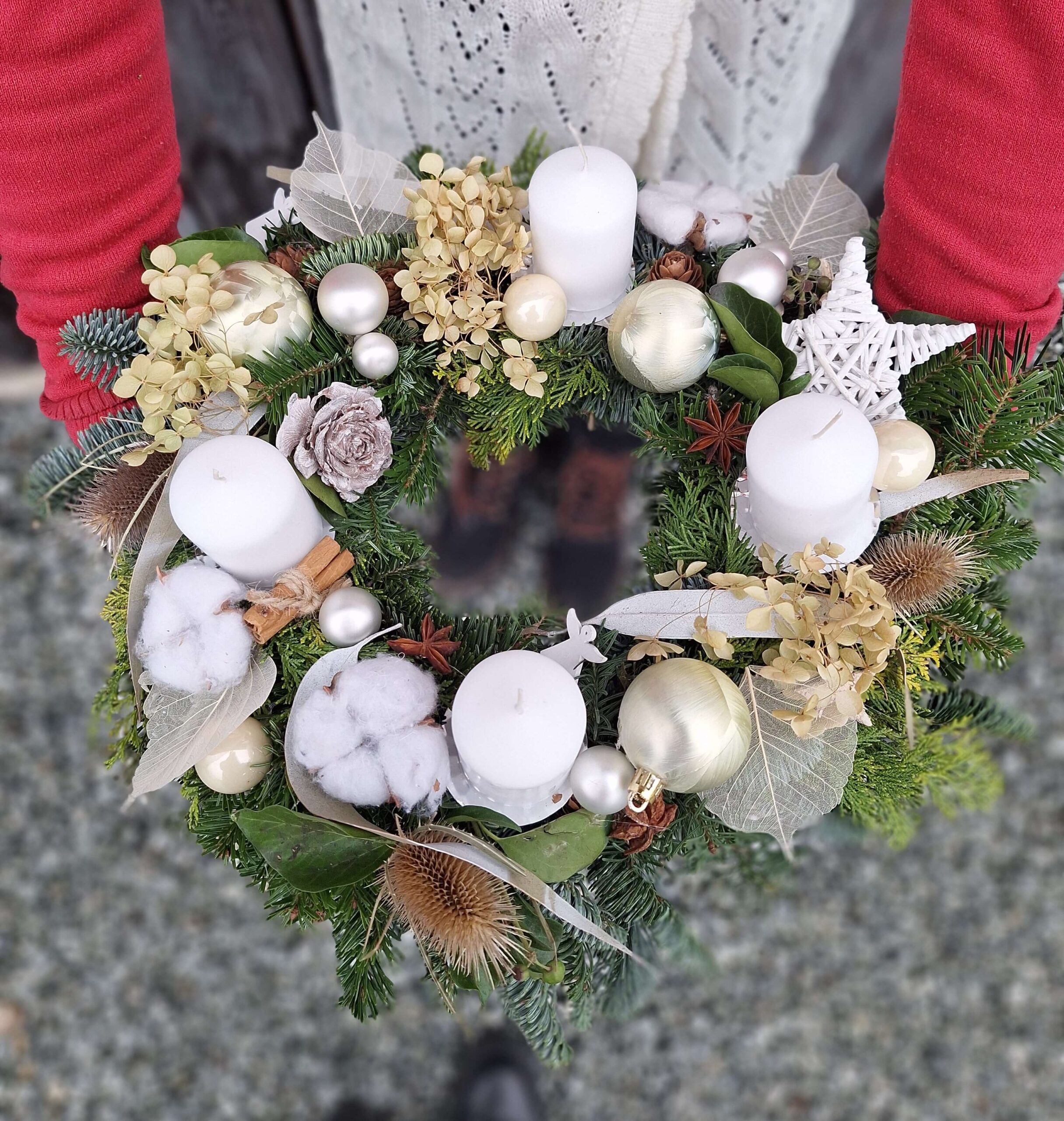 Odkryj nasz wyjątkowy Wianek Adwentowy Kremowa Biel. Delikatny Naturalny stroik świąteczny z bawełną i suszonymi kwiatami. Idealny Stroik bożonarodzeniowy biel i beż. Zamów Wieniec adwentowy biało-złoty z dostawą.