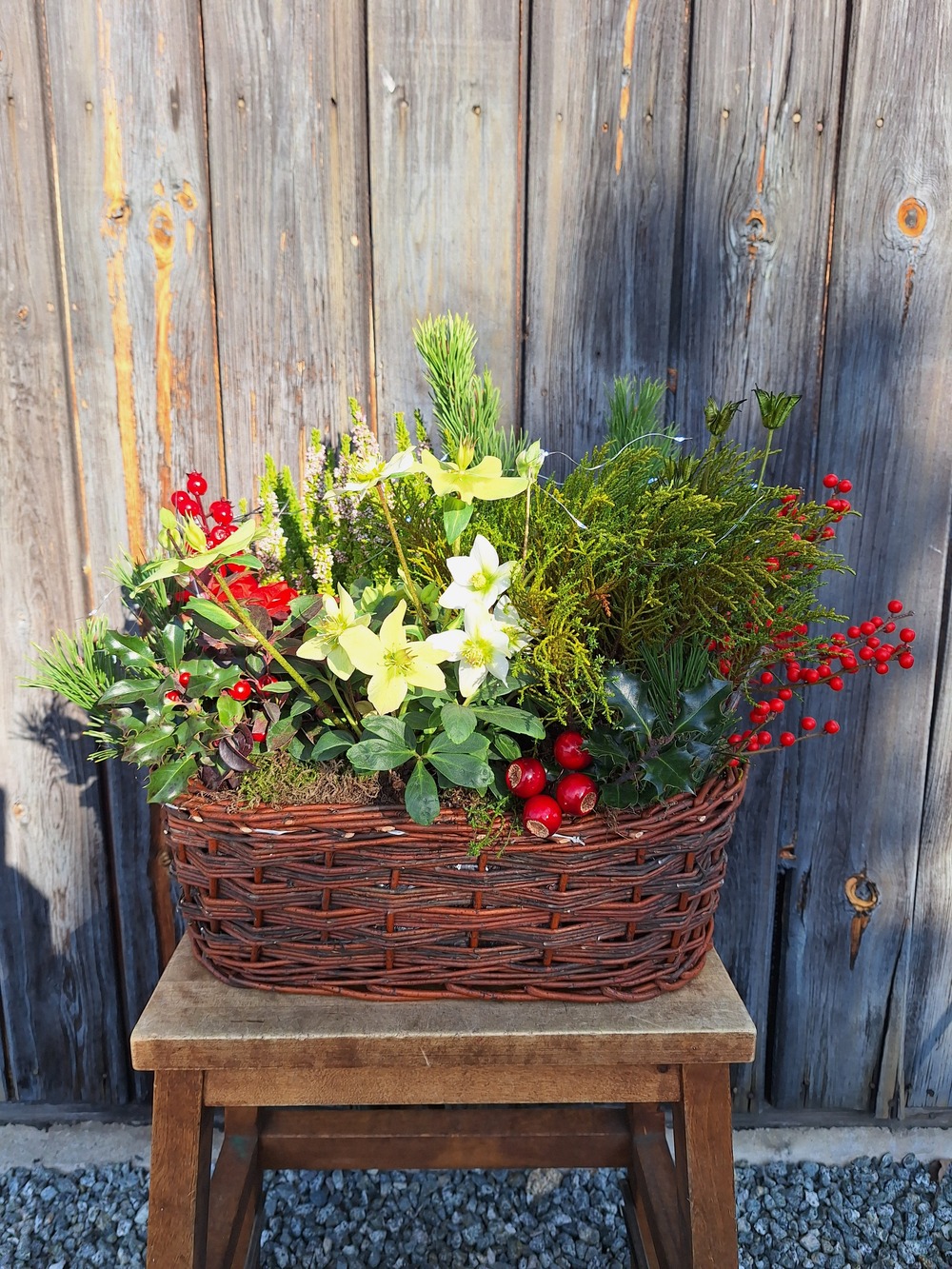 Rośliny stanowiące serce naszych kompozycji, takie jak golteria o intensywnie czerwonych owocach, dekoracyjny zielony wrzos, kalocefalus, hebe, skimia, bluszcz oraz elegancki ciemiernik, są wyjątkowo dekoracyjne zimą. Co najważniejsze, dobrze znoszą niższe temperatury, co czyni je idealnymi do zewnętrznych aranżacji.